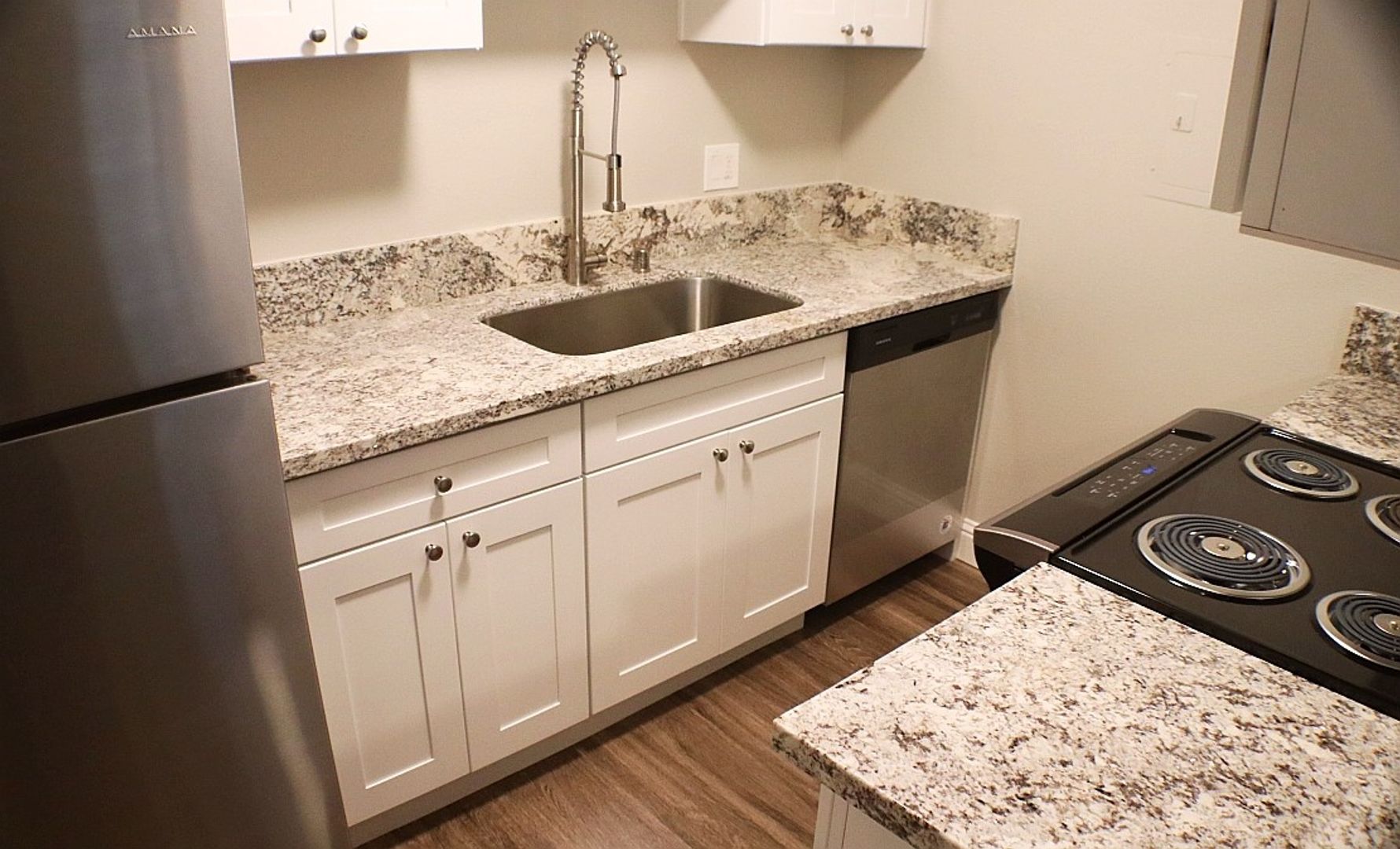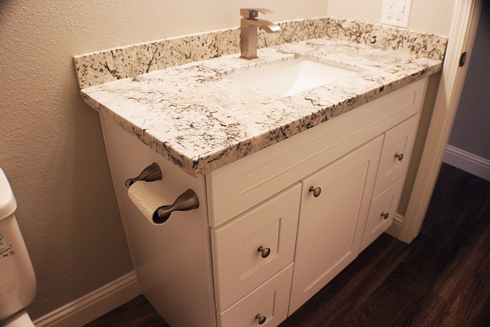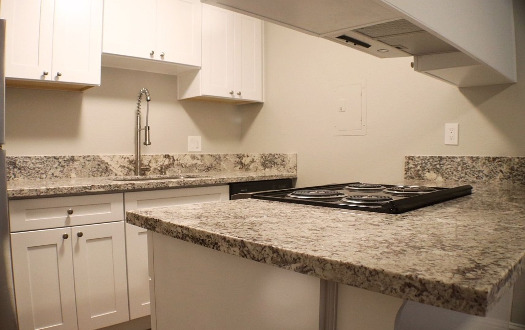 Newer granite countertops in the kitchen and bathroom ,
